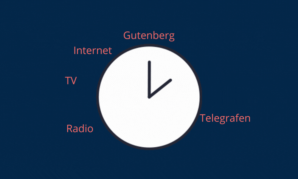Hvis man anskuer medieudviklingen, der reelt startede for over 500 år siden med Gutenbergs trykmaskine, som en time, står det ret klart, at der nærmest er tale om en eksplosiv proces.